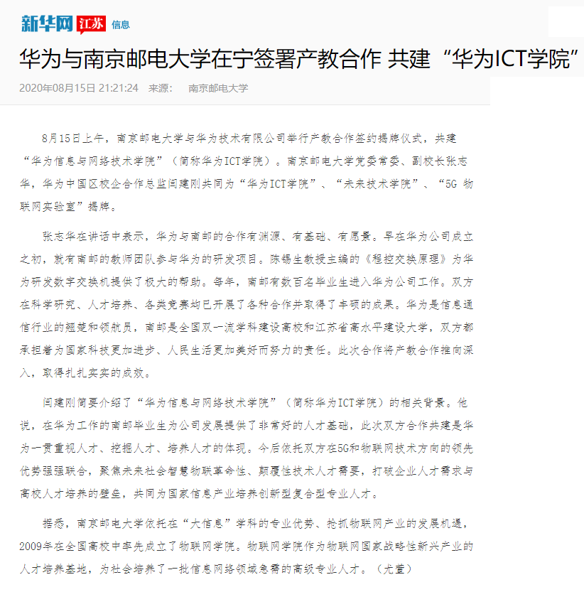 | 【新华网】华为与南京邮电大学在宁签署产教合作 共建“华为ICT学院” |