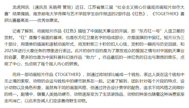 | 【龙虎网】将地球比喻成钱包聚焦环保话题 南邮学生自制创意动画获省级奖项 |