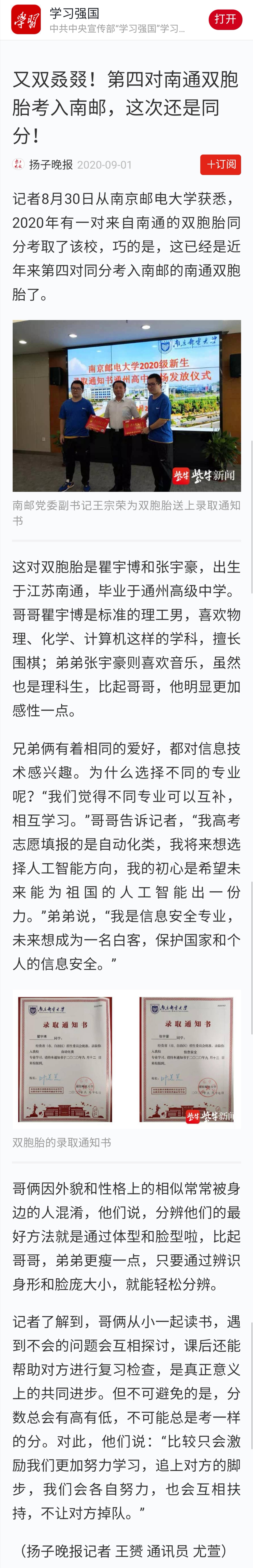 | 【学习强国】又双叒叕!第四对南通双胞胎考入南邮,这次还是同分! |