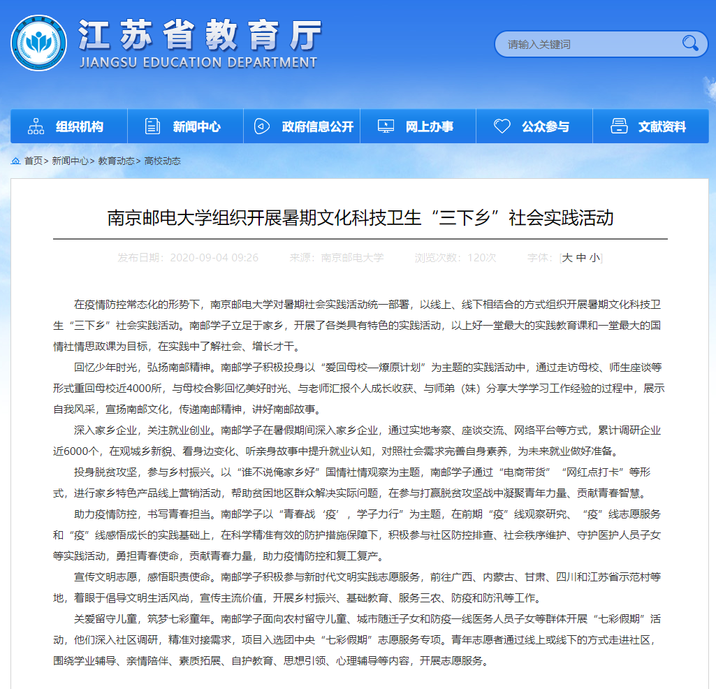 | 【省教育厅官网】南京邮电大学组织开展暑期文化科技卫生“三下乡”社会实践活动 |