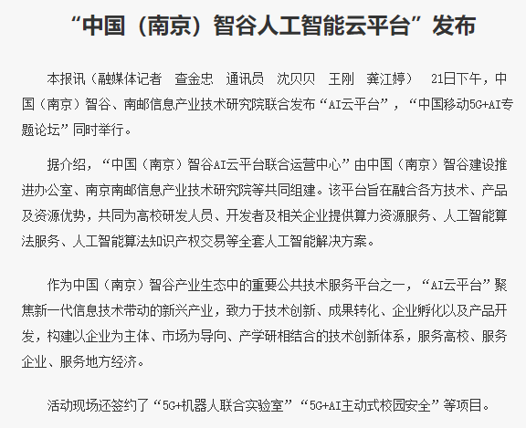 | 【南京日报】“中国(南京)智谷人工智能云平台”发布 |