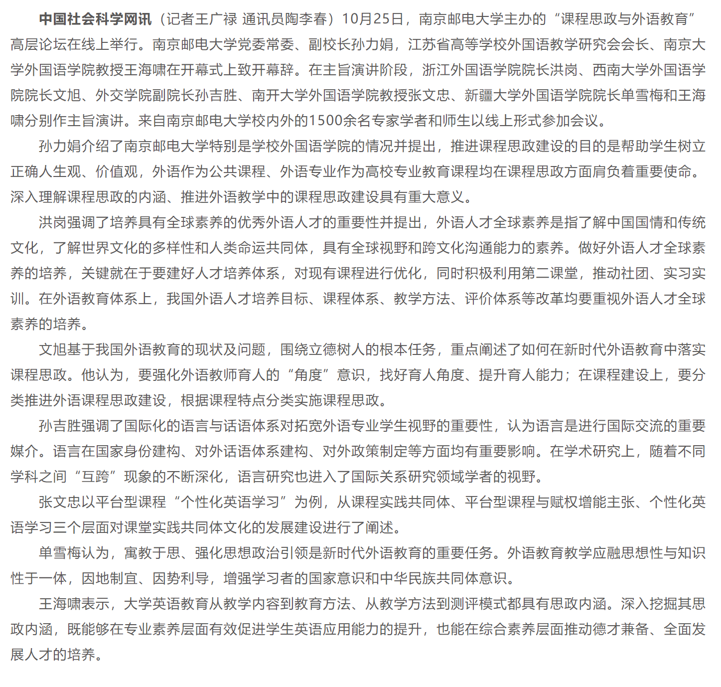 | 【中国社会科学网】南京邮电大学举办“课程思政与外语教育”高层论坛 |