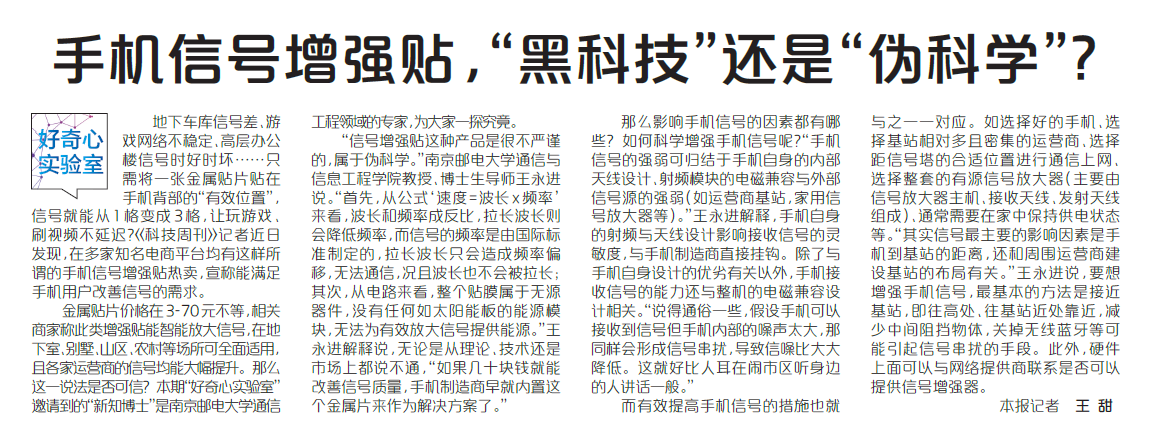 | 【新华日报】手机信号增强贴,“黑科技”还是“伪科学” |
