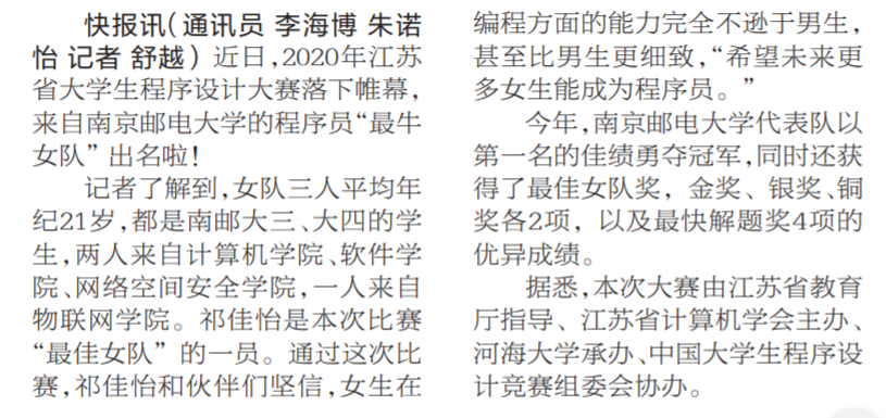 | 【现代快报】江苏大学生程序设计大赛“最佳女队”来自南邮 |