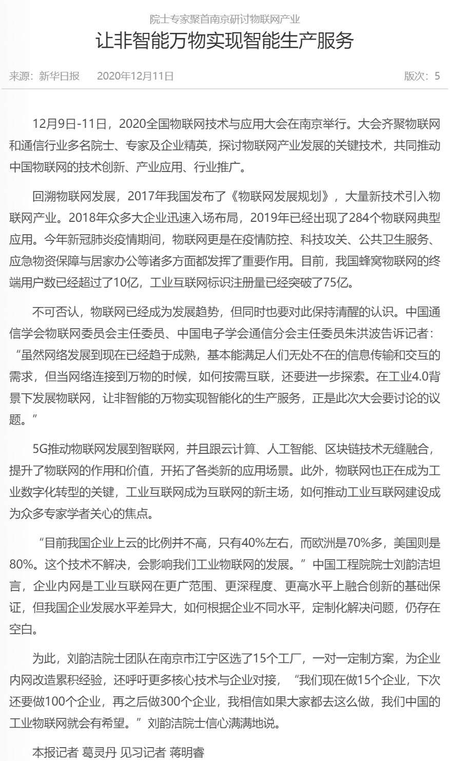 | 【新华日报】让非智能万物实现智能生产服务 |