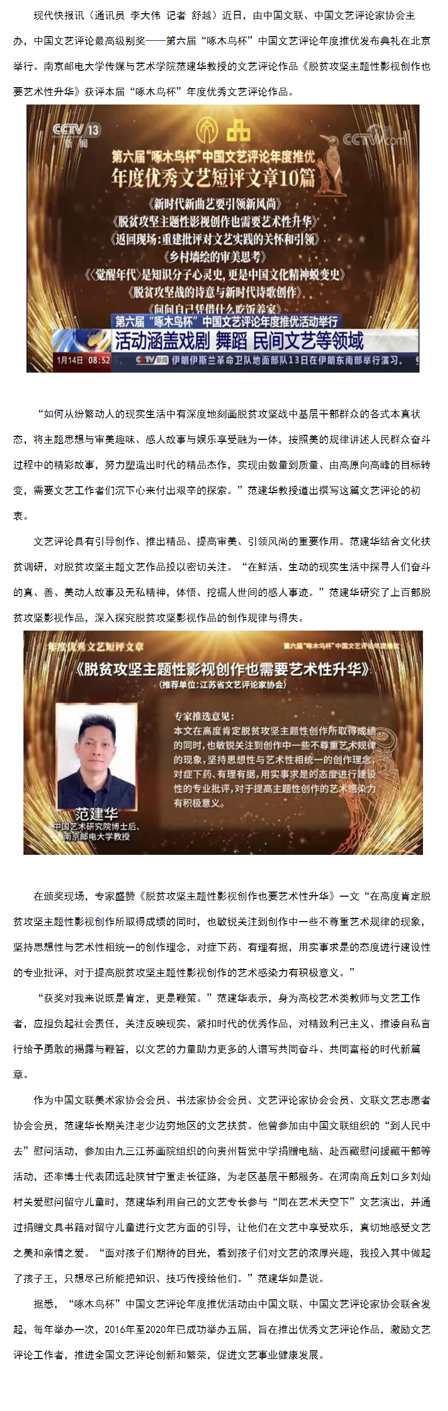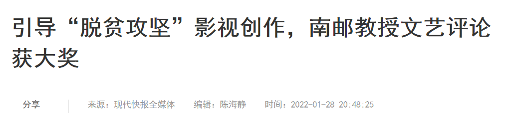 | 【现代快报全媒体】引导“脱贫攻坚”影视创作,南邮教授文艺评论获大奖 |