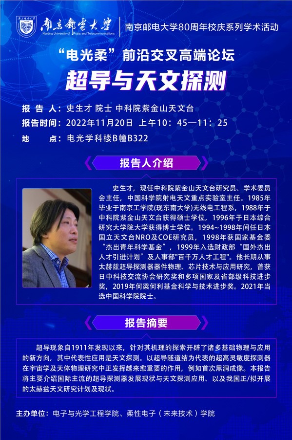 报告题目:超导与天文探测(南京邮电大学80周年校庆系列学术活动) 报告人:史生才院士 报告人单位:中科院紫金山天文台 时间:2022年11月20日10:45-11:25 地点:仙林校区电光学科楼B幢B322 主办单位:电子与光学工程学院、柔性电子(未来技术)学院 报告内容:超导现象自1911年发现以来,针对其机理的探索开辟了诸多基础物理与应用的新方向,其中代表性应用是天文探测。以超导隧道结为代表的超高灵敏度探测器在宇宙学及天体物理研究中正发挥越来愈重要的作用,例如首次黑洞成像。报告将主要介绍国际主流的超导探测器发展现状与天文探测应用、以及我国正/拟开展的太赫兹天文研究计划及现状。 报告人简介:史生才,中国科学院院士,中科院紫金山天文台研究员、学术委员会主任,中国科学院射电天文重点实验室主任。1985年毕业于南京工学院(现东南大学)无线电工程系,1988年于中科院紫金山天文台获得硕士学位,1996年于日本综合研究大学院大学获得博士学位。1994~1998年间任日本国立天文台NRO及COE研究员,1998-1999年3次入选国家级高层次人才,2021年当选中国科学院院士。长期从事太赫兹超导探测器器件物理、芯片技术与应用研究,曾获日中科技交流协会研究奖和多项国家及省部级科技进步奖,2019年何梁何利基金科学与技术进步奖。