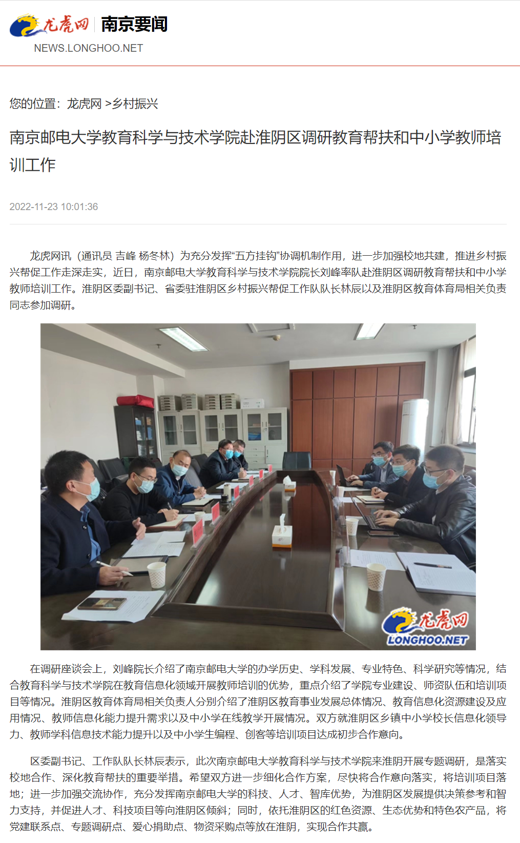| 【龙虎网】南京邮电大学教育科学与技术学院赴淮阴区调研教育帮扶和中小学教师培训工作 |