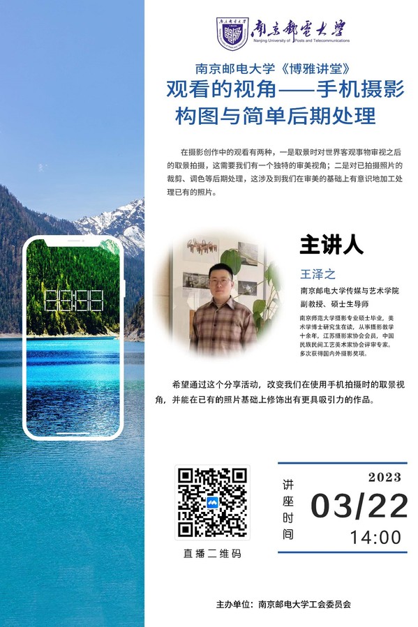 校工会将举办《博雅讲堂》文化润校系列活动《观看的视角——手机摄影构图与简单后期处理》讲座,欢迎参加学习。 时间:2023年3月22日(本周三)14:00 讲座开展方式:腾讯会议平台 讲座二维码:
