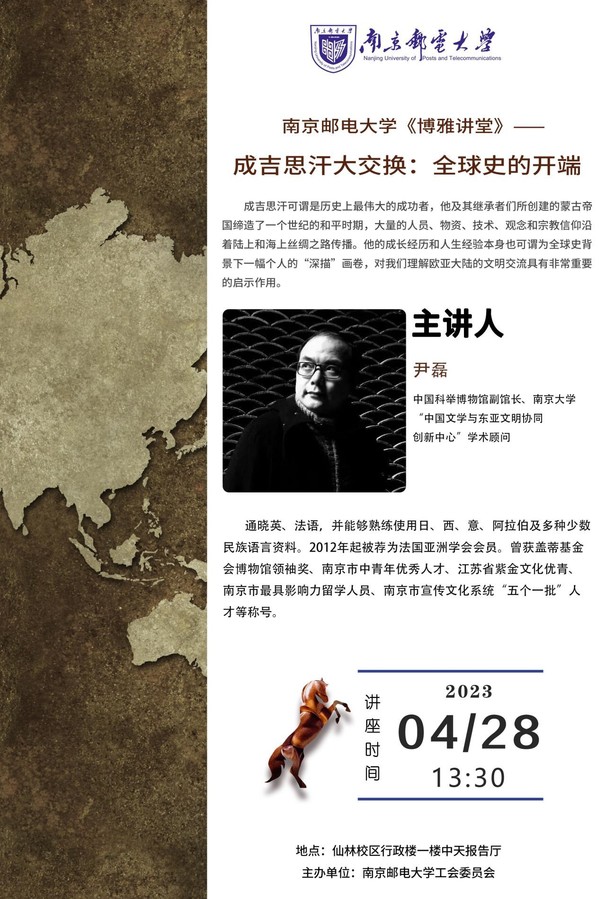 校工会将举办文化润校系列活动——《博雅讲堂》之《成吉思汗大交换:全球史的开端》讲座。 时间:4月28日(本周五)13:30 地点:仙林校区行政楼一楼中天报告厅 欢迎全校师生前往观听!