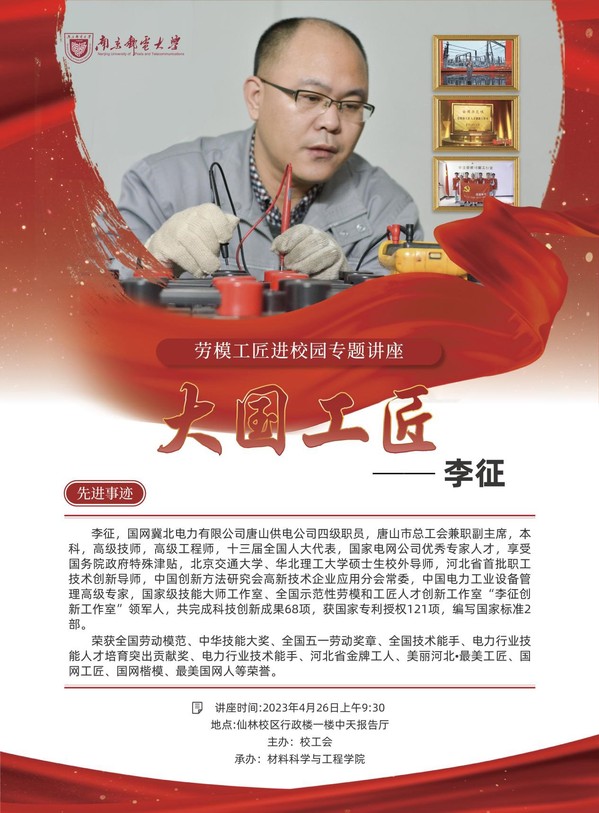 我校将举办劳模工匠进校园专题讲座。 时间:4月26日(本周三)上午9:30 地点:仙林校区行政楼一楼中天报告厅 欢迎全校师生前往观听! 主讲人简介: 李征,国网冀北电力有限公司唐山供电公司四级职员,唐山市总工会兼职副主席,本科,高级技师,高级工程师,十三届全国人大代表,国家电网公司优秀专家人才,享受国务院政府特殊津贴,北京交通大学、华北理工大学硕士生校外导师,河北省首批职工技术创新导师,中国创新方法研究会高新技术企业应用分会常委,中国电力工业设备管理高级专家,国家级技能大师工作室、全国示范性劳模和工匠人才创新工作室“李征创新工作室”领军人,共完成科技创新成果68项,获国家专利授权121项,编写国家标准2部。荣获全国劳动模范、中华技能大奖、全国五一劳动奖章、全国技术能手、电力行业技能人才培育突出贡献奖、电力行业技术能手、河北省金牌工人、美丽河北•最美工匠、国网工匠、国网楷模、最美国网人等荣誉。