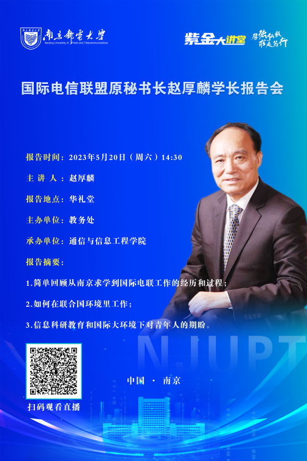 报告时间:2023年5月20日(周六)14:30 主讲人:赵厚麟 报告地点:华礼堂 主办单位:教务处 承办单位:通信与信息工程学院 报告摘要: 1. 简单回顾从南京求学到国际电联工作的经历和过程; 2. 如何在联合国环境里工作; 3. 信息科研教育和国际大环境下对青年人的期盼。 报告会同步直播,收看二维码如下: