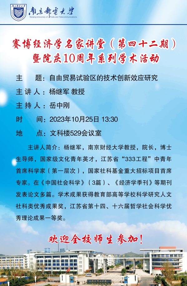 | 南京财经大学杨继军教授学术报告:《自由贸易试验区的技术创新效应研究》 |