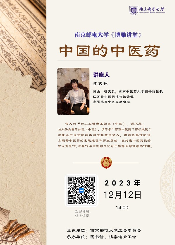 校工会文化润校系列活动——《博雅讲堂》将于2023年12月12日14:00举办《中国的中医药》讲座。 时间:2023年12月12日(下周二)14:00 讲座开展方式:腾讯会议平台 讲座二维码: