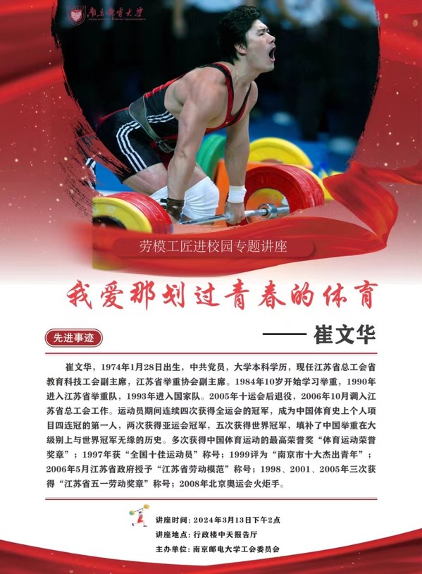 校工会将举办劳模工匠进校园专题讲座——《我爱那划过青春的体育》,安排如下: 时间:2024年3月13日(下周三)14:00 地点:仙林校区行政楼一楼中天报告厅 欢迎师生届时聆听讲座。