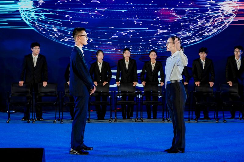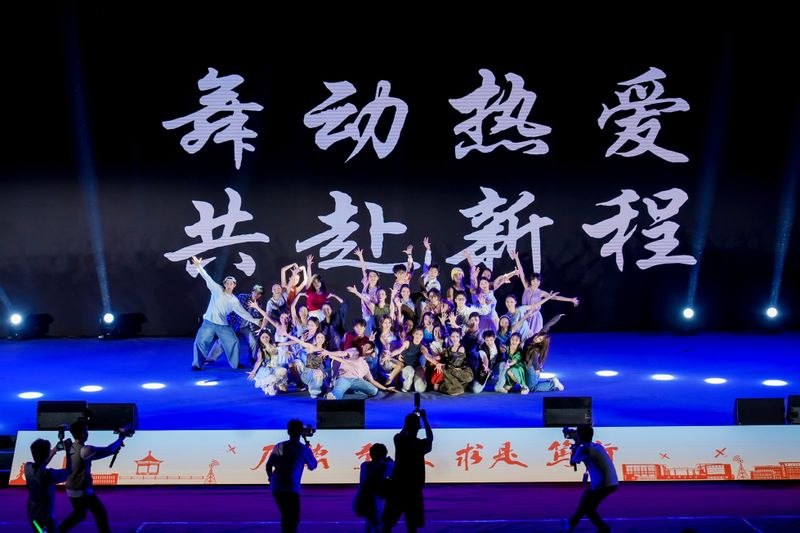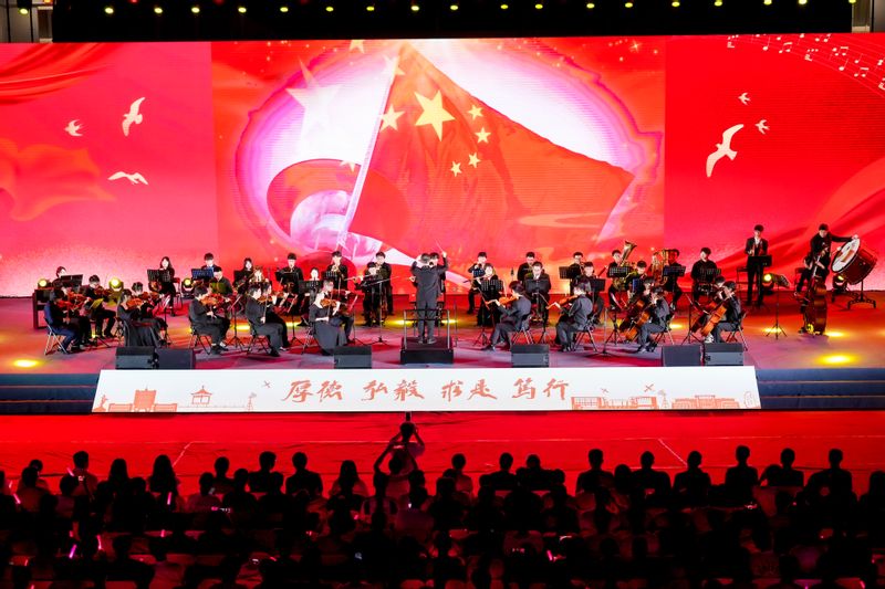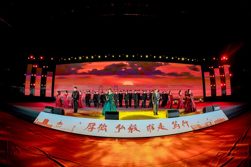 龙狮舞《龙腾华夏》 乐队演奏《Amani》《无题》以深沉的立意和独特的艺术表达引起观众共鸣,呼吁大家铭记抗战历史、珍视和平。合唱《沂蒙山歌+在森林的那一边》用声线交织诉说岁月情怀,描述大地织就的绿色梦境,每一片绿荫下蛰伏着奇妙的故事;话剧《奔跑者》用舞台叙事解构成长隐喻,通过讲述我国通信事业从跟跑、并肩跑到世界领跑的故事,引发新生对“人生赛道”的深度思考;合唱《领航新时代》在声浪中凝聚时代力量,离退休老教师代表印为民、杨庚与来自不同民族的同学们共同唱响对伟大征程的无限憧憬与坚定信念,用激情四溢的歌声和热情洋溢的表演展现对祖国的热爱,56个民族像石榴籽一样始终紧紧地团结在一起,共筑实现中华民族伟大复兴的中国梦。