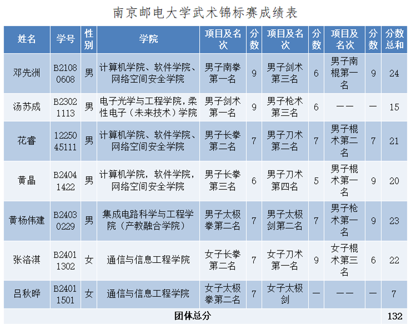 10月11—13日, 2025年江苏省大学生武术(套路)锦标赛在扬州大学举行。南京邮电大学武术队获甲B组团体总分第一名,收获6金7银4铜。 汤苏成、邓先洲、黄杨伟建、黄晶、张洛淇同学分别获男子剑术、男子南拳南棍、男子枪术、男子棍术、女子刀术项目金牌。花睿、黄杨伟建、张洛淇、吕秋晔同学分别获男子长拳、棍术、刀术、男子太极拳、太极剑、女子长拳、女子太极拳项目银牌。邓先洲、汤苏成、黄晶、张洛淇同学分别获男子剑术、男子枪术、男子长拳、女子棍术项目铜牌,黄晶同学还获得男子刀术第四名。