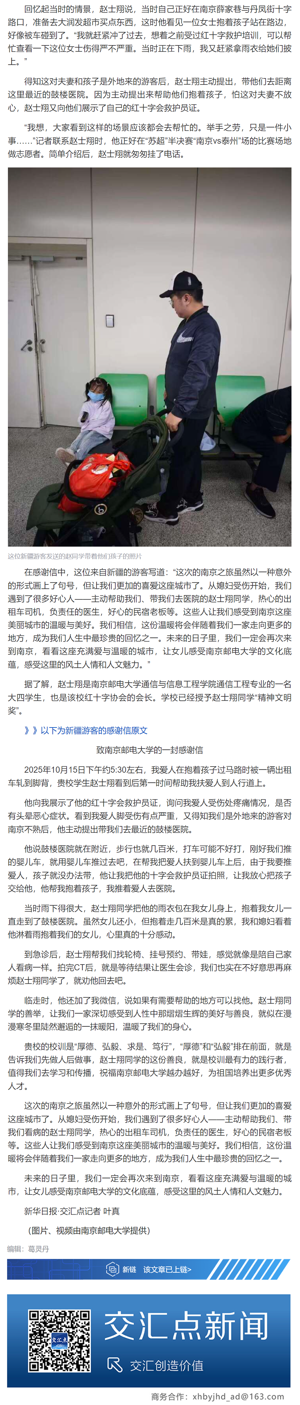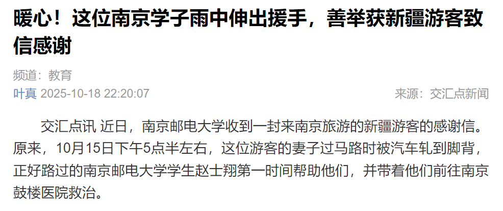 | 【新华日报客户端】暖心!这位南京学子雨中伸出援手,善举获新疆游客致信感谢 |